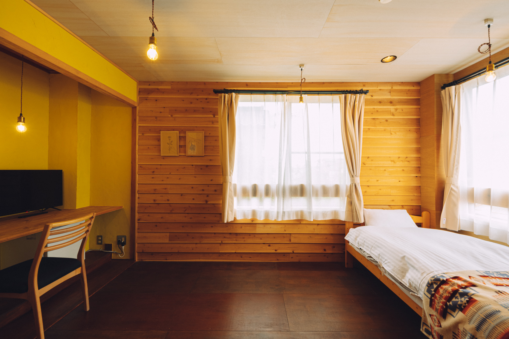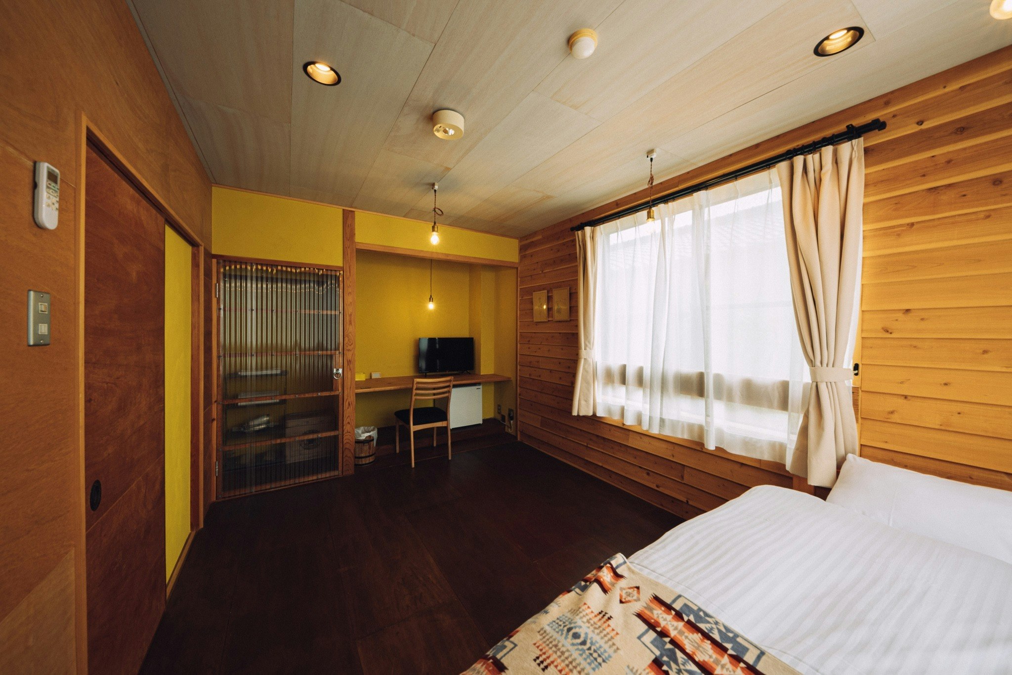 当館で、一番広い部屋です。ストローイエローの塗壁と杉材の鎧張りで仕上げた角部屋。広い二つの窓からは、荒尾駅と列車が24時間眺めることができ、ノスタルジックな空間となっています。追加マットレスになりますが、親子4人まで対応可能です。