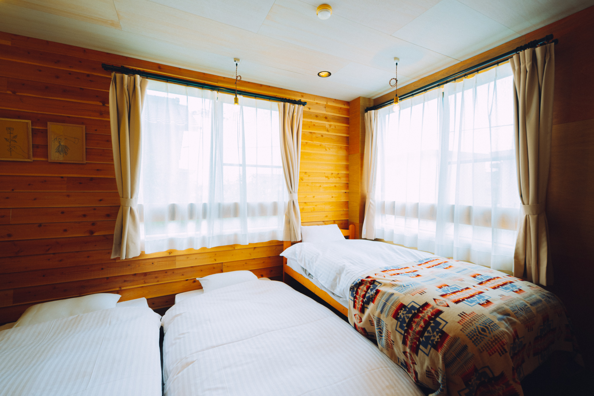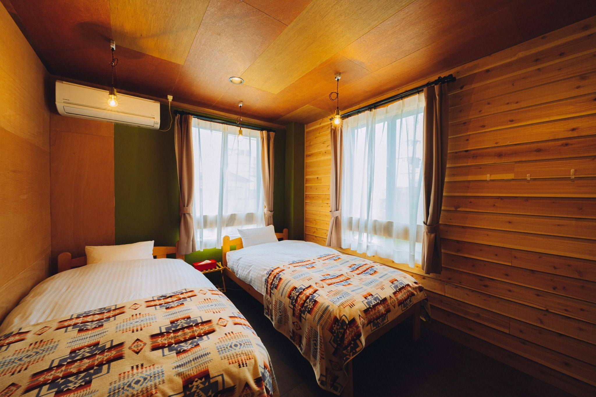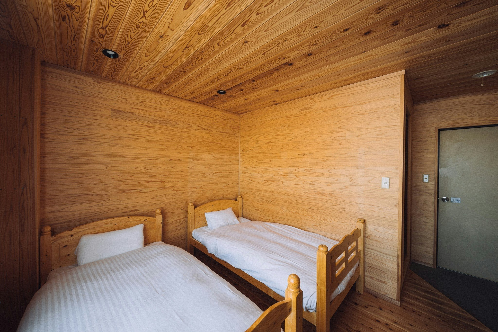スタンダードなホテルタイプのツイン・ルーム。北欧風ペンションのイメージをヒノキ材と珪藻土で再現した渾身のひと部屋。ピスタチオグリーンの天井は森の中にいるような安らぎを感じさせてくれます。