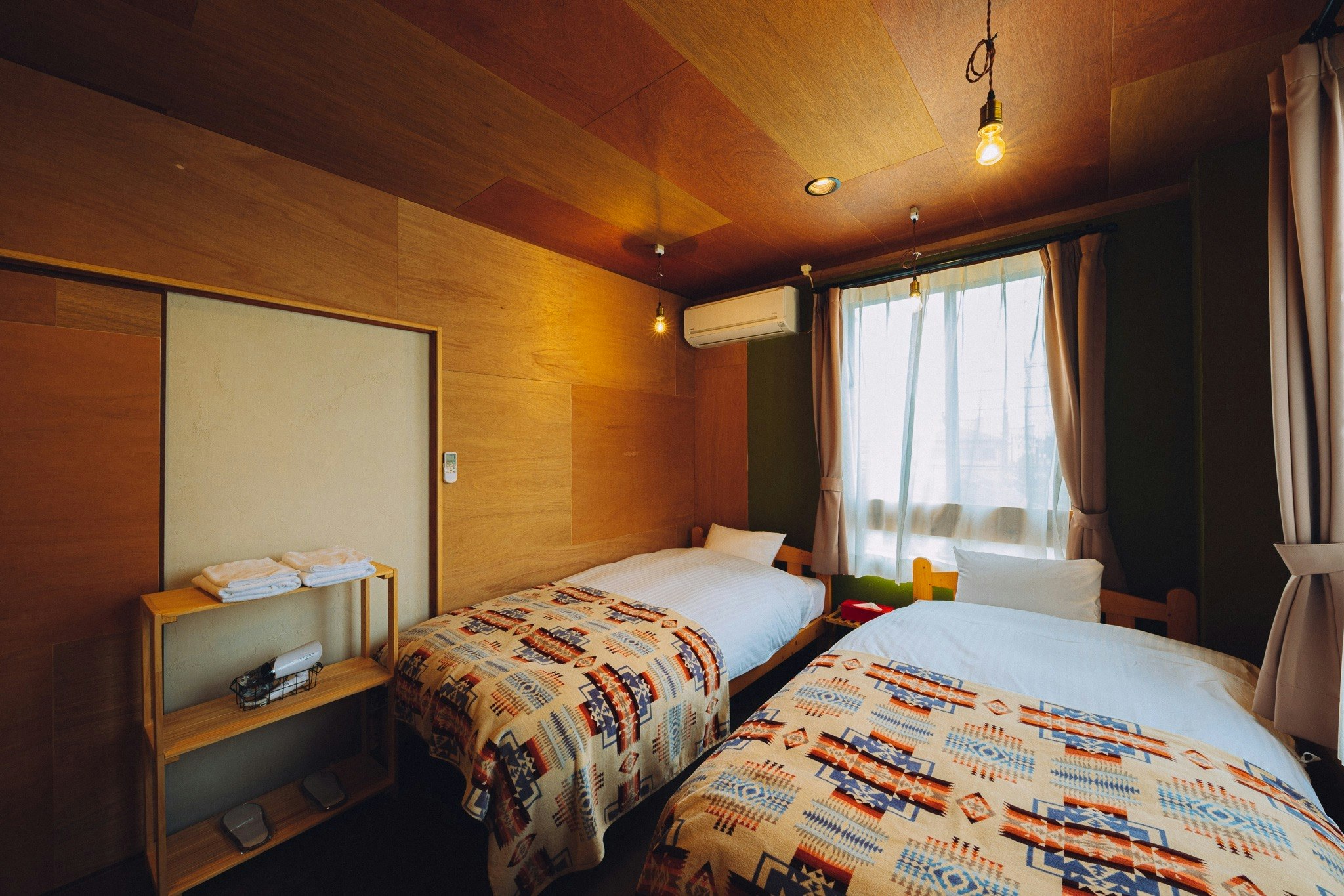 全面ウッディー調になっているツインルームです。 お部屋に入ると木の香りが広がります。 唯一の3階にあるお部屋になっており、窓から電車が見えます。